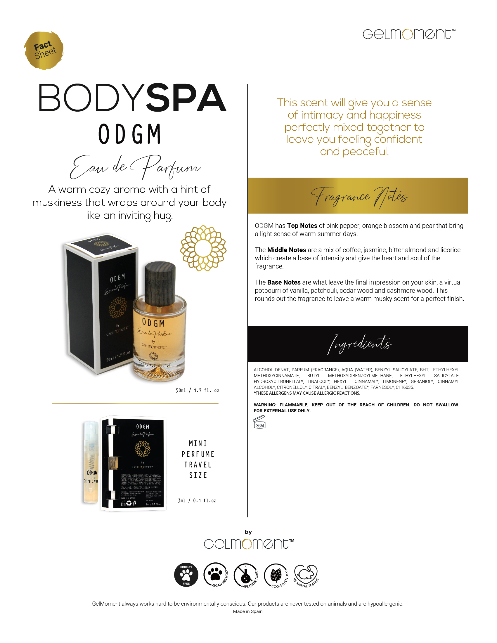 A warm cozy aroma with a hint of muskiness that wraps around your body like an inviting hug. This scent will give you a sense of intimacy and happiness perfectly mixed together to leave you feeling confident and peaceful.